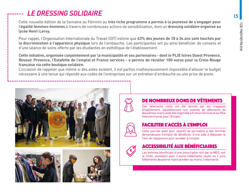 Source : "Le dressing solidaire". extrait du journal municipal n°48 "PSL ma ville" (Port Saint Louis du Rhône) publié le 25/04/2024, consultable sur le site « https://www.portsaintlouis.fr/publications/journal-municipal-n48/ »