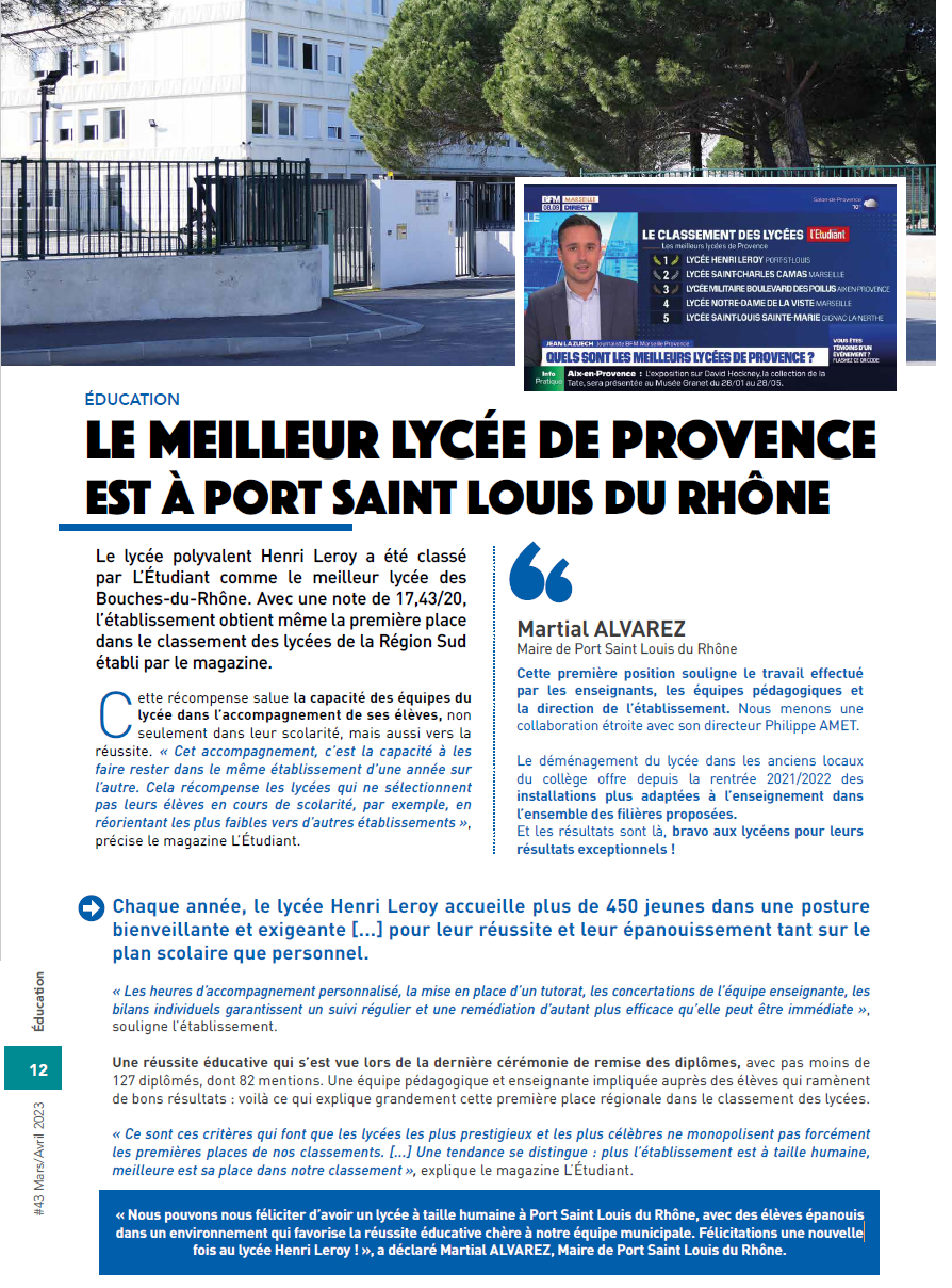 Source : « Le meilleur lycée de Provence est à Port Saint Louis du Rhône » extrait du journal municipal n°43 "PSL ma ville" (Port Saint Louis du Rhône) publié le 22/05/2023, consultable sur le site « https://www.portsaintlouis.fr/publications/journal-municipal-n43/ »